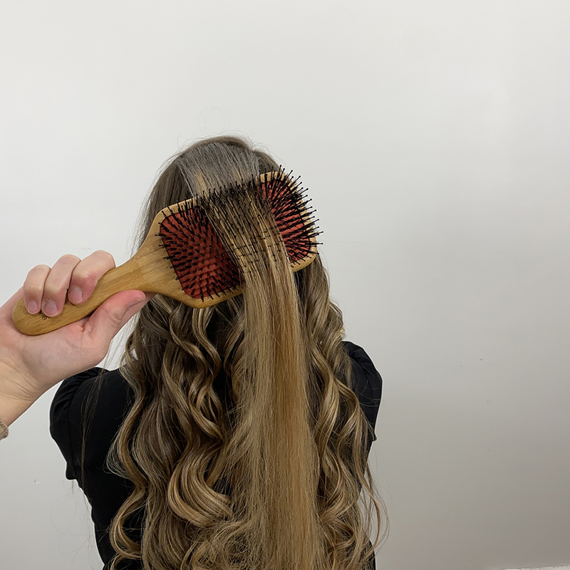 - Use a tail comb to soften curls or a paddle brush to add polish and shine.