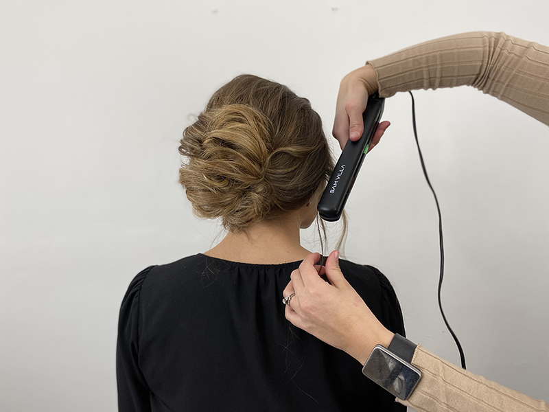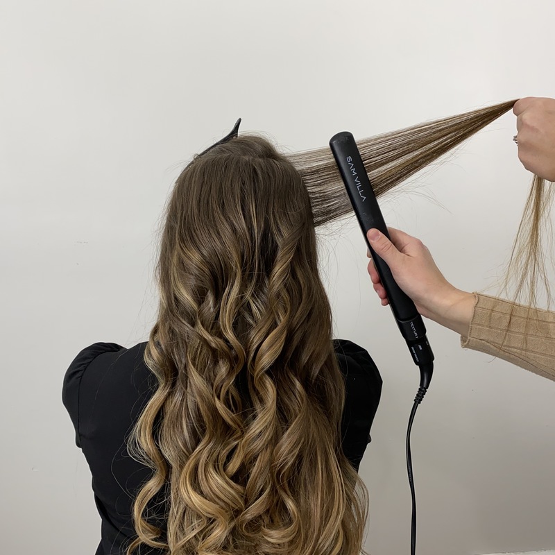 - Curl remaining pieces around the hairline with a Sam Villa Signature Series Sleekr Professional Straightening Iron