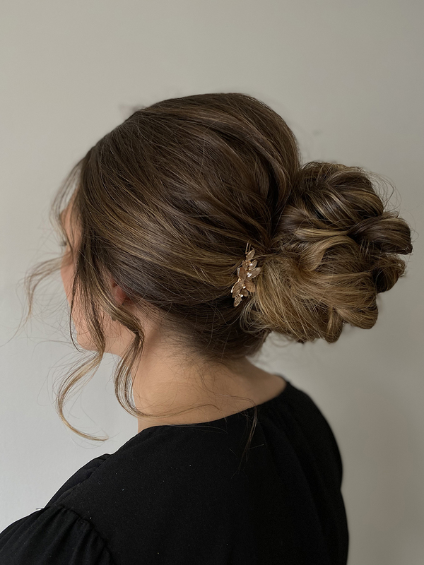 - Take the remaining hair and create texture and movement around the bun by detailing with a tail comb and fingers. Option: Add an adhesive lining of pearls (craft stores carry them), for added polish.