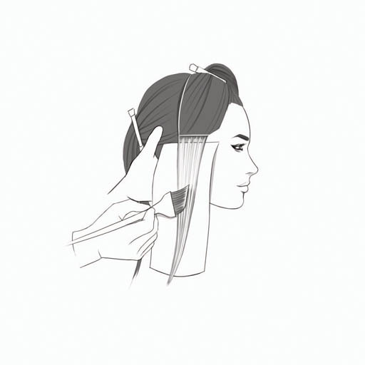 Step 1: Start by taking a 1/4-inch horizontal sub-section above the ear on the right temporal region. Weave section, place on a foil, and apply FORMULA A from 1/4 inch off scalp to the start of pre-lightened ends. Do not overlap.