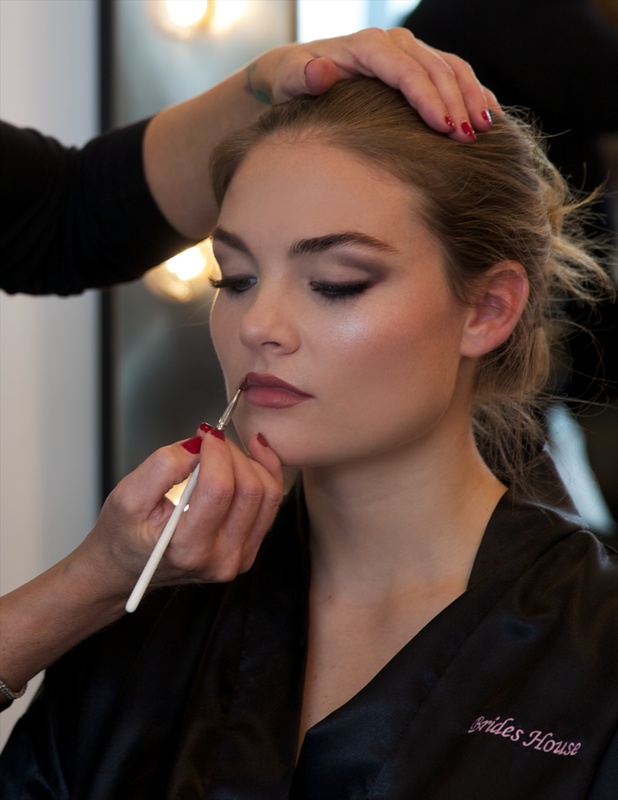 Use a lip brush to apply long wear lip color. Go just outside the natural lip line and fill in entire lip. Allow to dry and add lipstick or gloss, if desired.