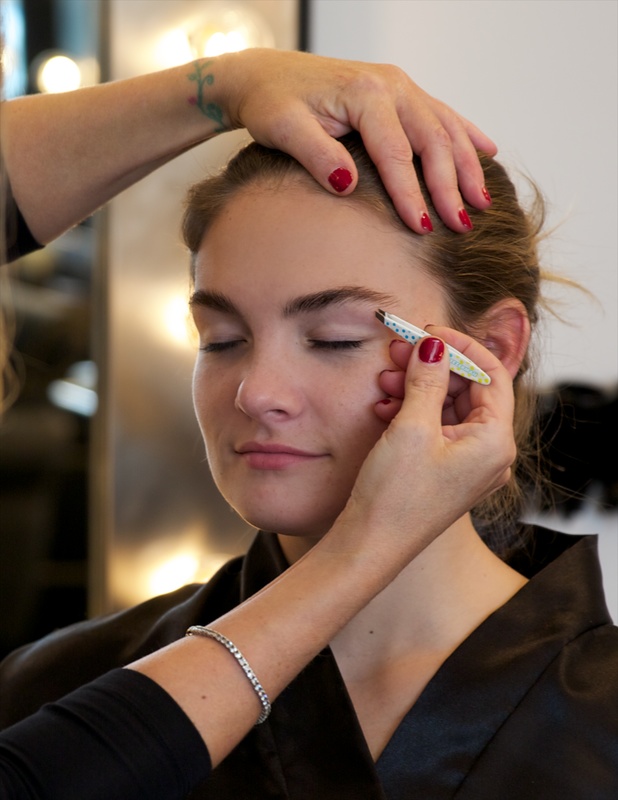 Begin with clean, moisturized skin. Tweeze any stray brows.