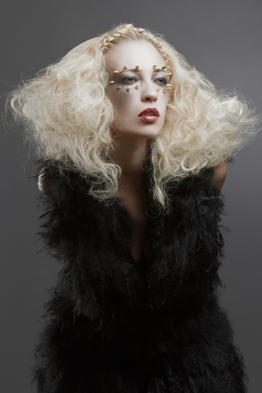 The hair was created and inspired by my favorite muse and means, which is texture. I am also always experimenting with different ways to unconventionally create diverse types of texture in the hair. The spikes were a play off the chaotic texture and a story to support the feelings this collection created; these textures are non-commercial and futuristic.