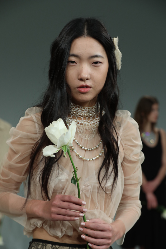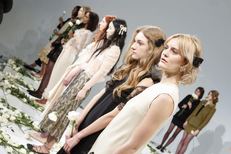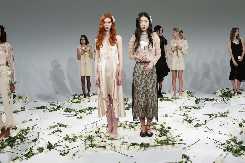 With roses strewn on the floor and models placed in pairs, Mémère put on quite the presentation at NYFW. Their Fall 2017 collection, highly romanticized, brought together elements of 19th century and the Industrial Revolution era. With lace and embroidery and silky draped fabrics, classic beauty shined.