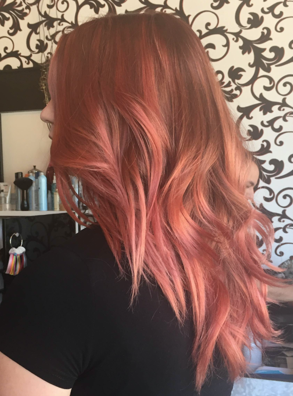 Rose gold is by far my favorite "fantasy hair color" trend! It looks good on countless skin tones and when done in a subtle manner can be incorporated into most clients appointments (peekaboos, shine lines, ombre)!