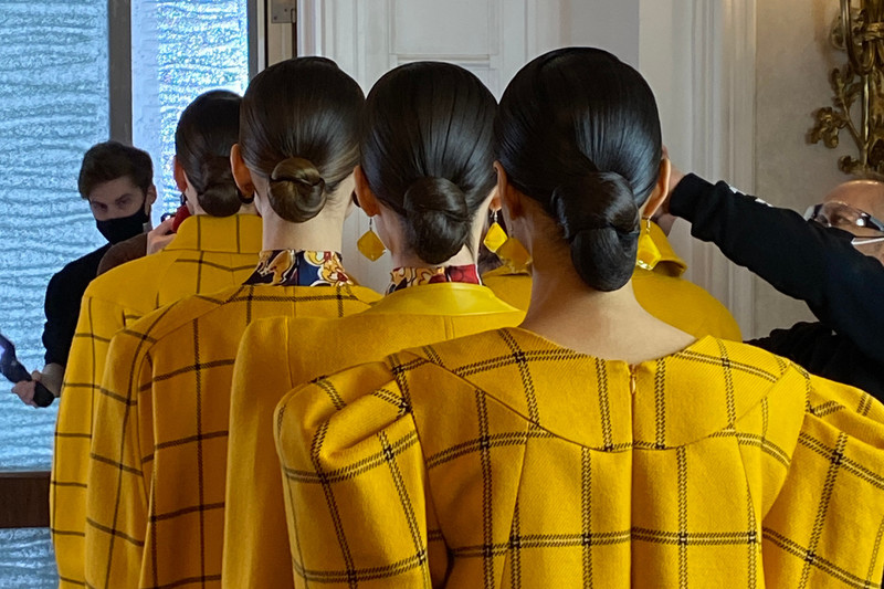 “Working on the Paul Costelloe AW21 show, the TONI&GUY session team embraced the craftsmanship of the classic chignon, with a strong, tailored, low-side parting to work with the silhouettes and tailoring of the collection.” — Cos Sakkas, TONI&GUY international artistic director and head of education