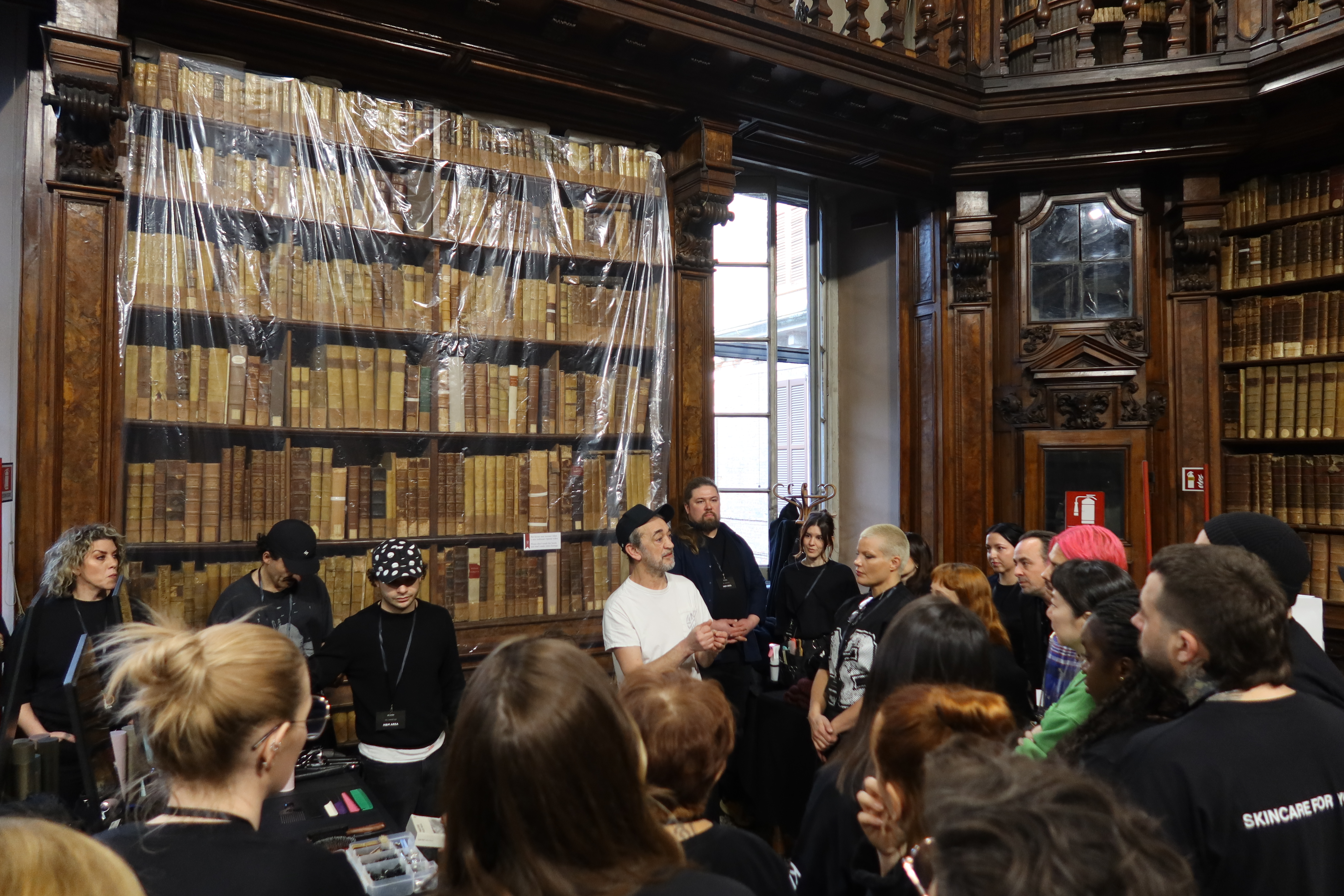 One of the most notable details backstage was how texture was achieved. Instead of traditional volumising or high-hold techniques, Souleiman used BODY.BUILDER in an unconventional way — painting it into the hairline rather than using it to amplify body. When left to dry naturally, it created a soft, satin hair finish. “We didn’t use it to create body,” he says. “We used it because when it dries naturally, it gives this incredibly beautiful satin finish. You get shine, but it’s not glossy or hard. It feels real,” he adds.