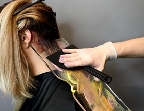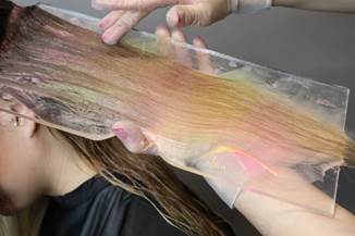 Step 5: Once paddle glides are complete, starting with the top of the board, carefully peel the board down and away from the section to release the hair. Repeat steps throughout the left and right side of the head until all color has been applied.