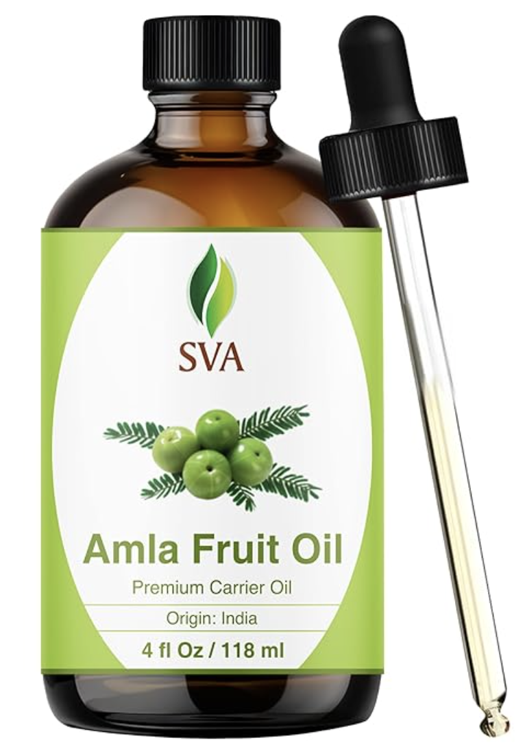 - Amla oil (Indian gooseberry): Rich in vitamin C and antioxidants, helps strengthen roots, reduce thinning and greying.