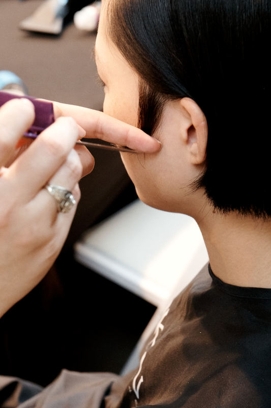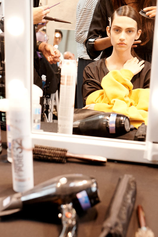 “There’s a nod to the 20s and to the bourgeoisie this season at Prada. However, there’s still a bit of strangeness to the look with a contemporary spin, which is classic Prada. I’ve added in little sideburns on each girl that add a touch of boyishness. There are details in this look’s simplicity that lend themselves to different references, all while staying very Prada. This look on every model adds a touch of uniformity, while still allowing the models’ personalities to shine through in their own way. I’ve used Redken’s NEW! Extreme Play Safe leave-in to heat protect and the NEW! Redken Triple Pure 32 Hairspray to hold the look.” – Redken Global Creative Director Guido Palau