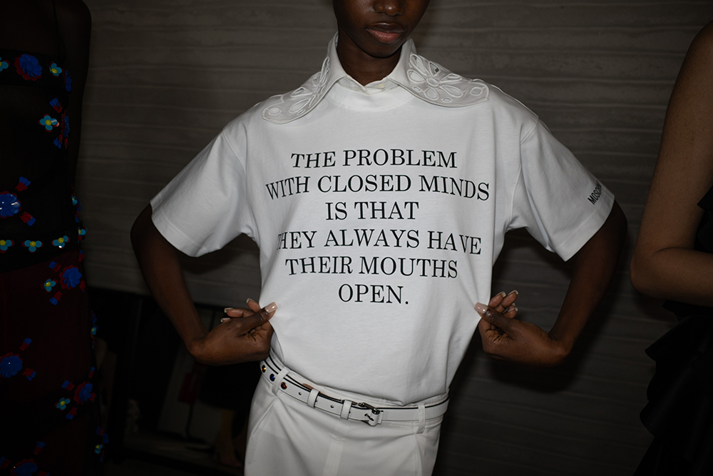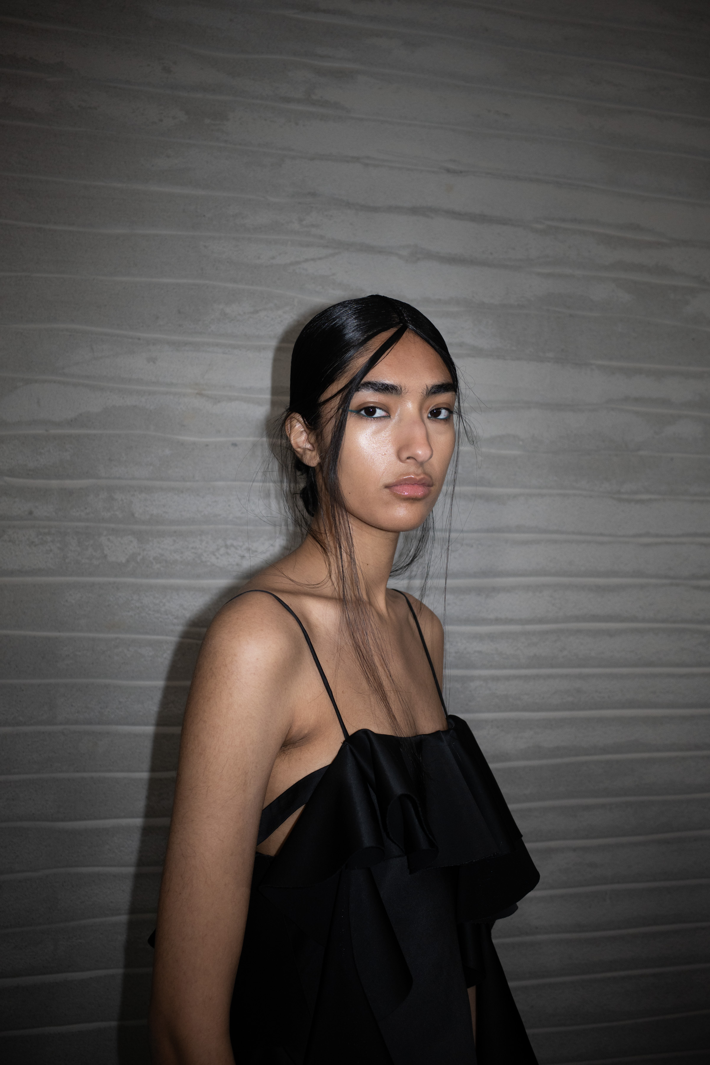signature language — it’s witty, curious,” says Souleiman. “We wanted the hair to feel as diverse as the collection, and a kind of tongue-in-cheek too. It’s about contradiction, sharp structure meeting soft, unraveling movement. Polished, but slightly undone.”