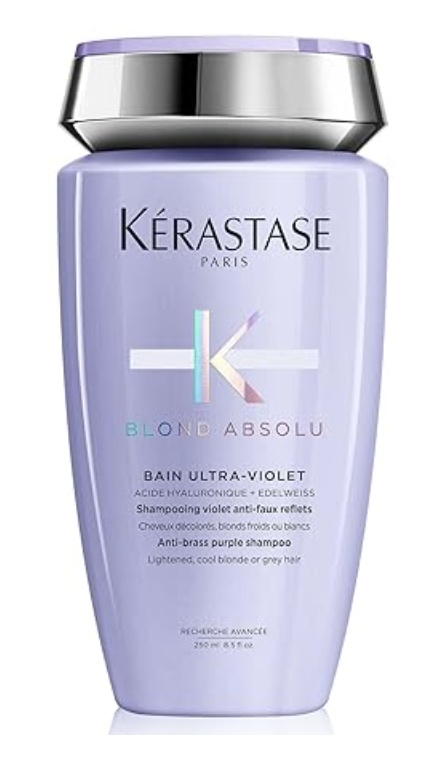 A purple shampoo can help neutralize brassiness and keep silver tones looking bright rather than yellow. One of the most widely recommended options among stylists is Kérastase Blond Absolu Bain Ultra‑Violet Shampoo. Formulated with ultraviolet pigments and hydrating ingredients like hyaluronic acid, it helps cancel out yellow undertones while strengthening and moisturizing the hair fiber.