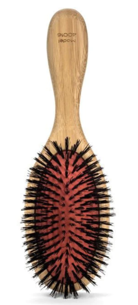 - Once curls have cooled, drop out sections (avoiding fringe section) and brush back to a high ponytail with a Sam Villa Artist Series Finishing Brush and secure with elastic. Pull elastic away from the head about 2”, create a parting hole and turn the tail up, over and through, then pull tight.